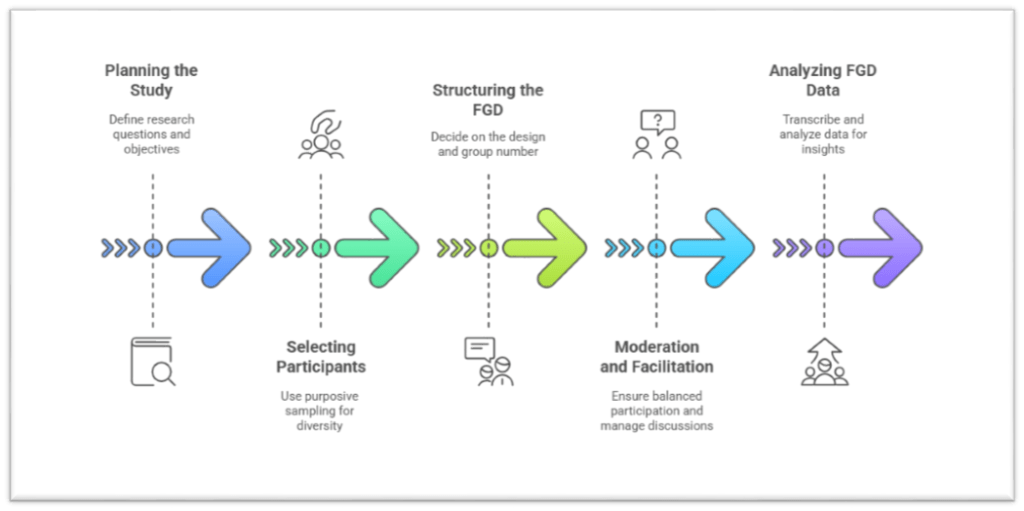 - Structuring the FGD – Choose a format (single-category, multiple-category, or broad-involvement) and plan for multiple groups to achieve data saturation. The discussion guide should be flexible enough to allow for spontaneous insights while staying focused on the research objectives.