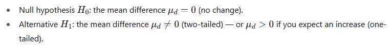 Conclusion: There is strong statistical evidence that the training program changed the athletesโ scores (here, the mean score increased by 2.75 units). The result is highly significant (p โช 0.01).