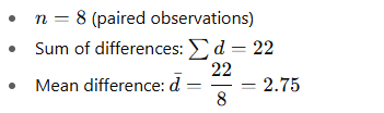 - The distribution of differences is approximately normal (for small nnn). With n=8n=8n=8 itโs good to check a histogram or normality test; with larger nnn the t-test is robust.