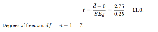 In this example the average improvement after training was 2.75 units (SD of differences = 0.71). The paired t-test yields t(7)=11.00, p<0.001. We therefore reject the null hypothesis and conclude the training produced a statistically significant improvement โ also a very large practical effect (Cohenโs d โ 3.9d).