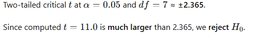 Since computed t=11.0t = 11.0t=11.0 is much larger than 2.365, we reject Hโ โ.