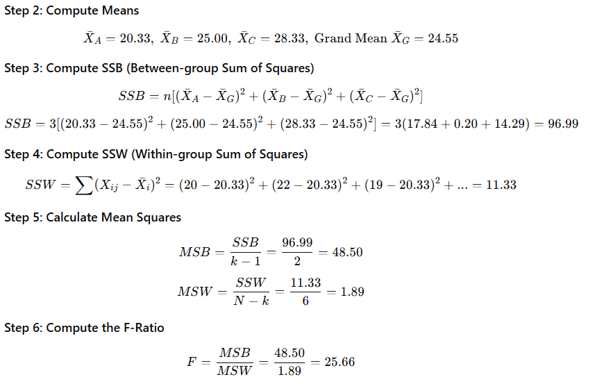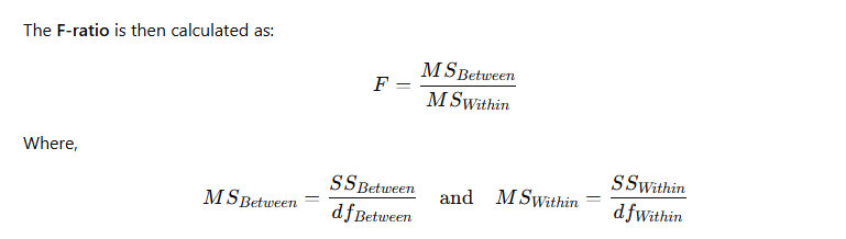 - Between-group variation (SSB): Variation due to the difference between group means.