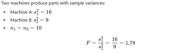 | F-Test | Compare two variances | Compare variances of two production machines |